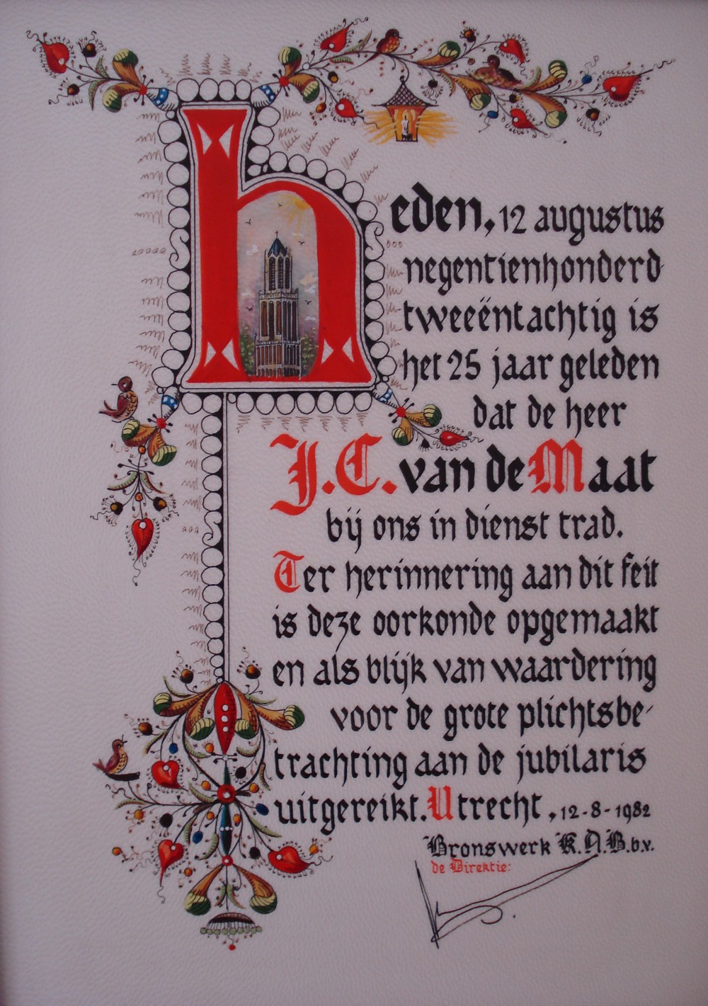 Met je 25 jarige jubileum ontving je, behalve een extra netto maandsalaris en een zilveren Bronswerk speld, ook een oorkonde waarop in fraaie gotische letters, omlijst met fijn geschilderde bloemen en de Domtoren, een tekst met o.m. je naam en het aantal dienstjaren vermeld stond.